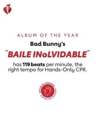 With this year's halftime show, you could learn how to save a life and be the life of the party. The American Heart Association reminds us that the 119-beats per minute tempo of BAILE INoLVIDABLE, the single from Bad Bunny's Grammy-winning album of the same, name is the right tempo for hands-only cardiopulmonary recussitation (CPR). Haga clic aquí para leer en español.